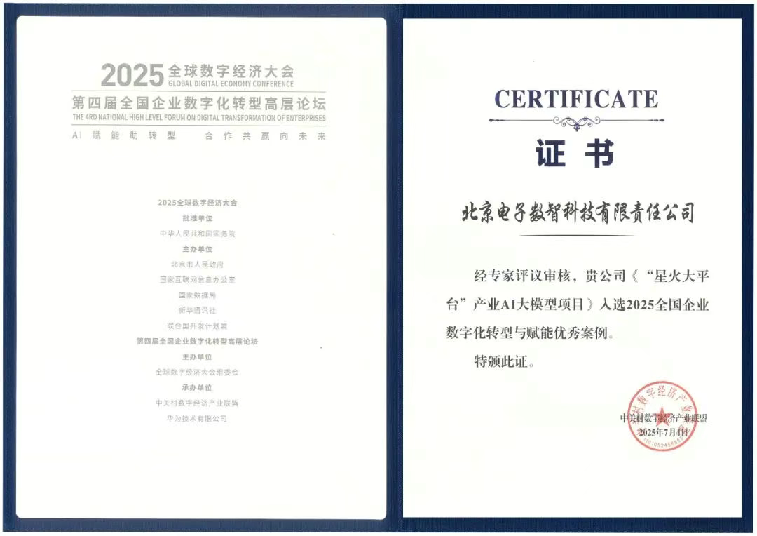 北电数智携人工智能赋能数字友好城市建设的最新成果展现出AI技术落地的“硬实力”,在“算力互联网×数字园区新质发展论坛”上分享基于“星火·大平台”助力城市数字化转型的洞察和实践,并获评两项优秀案例。其中,《“星火·大平台”产业AI大模型项目》入选2025全国企业数字化转型与赋能优秀案例;《基于可信数据空间与专病大模型在医疗领域的应用》入选北京人工智能赋能产业发展典型案例,为产业数智化升级和推动人工智能与实体经济深度融合提供实践参考。